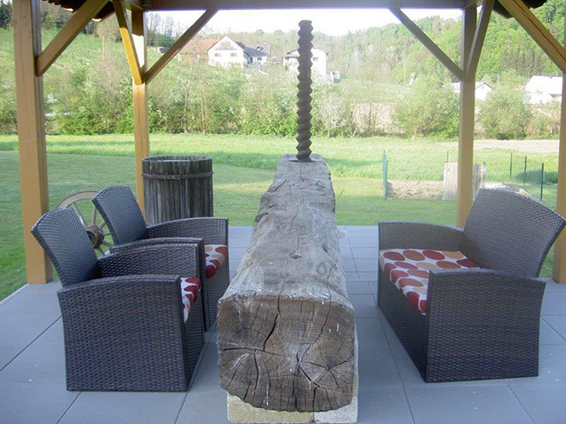 Schöner Dreikanthof, mit Gartenmöbeln und Liegestühlen zum Relaxen .